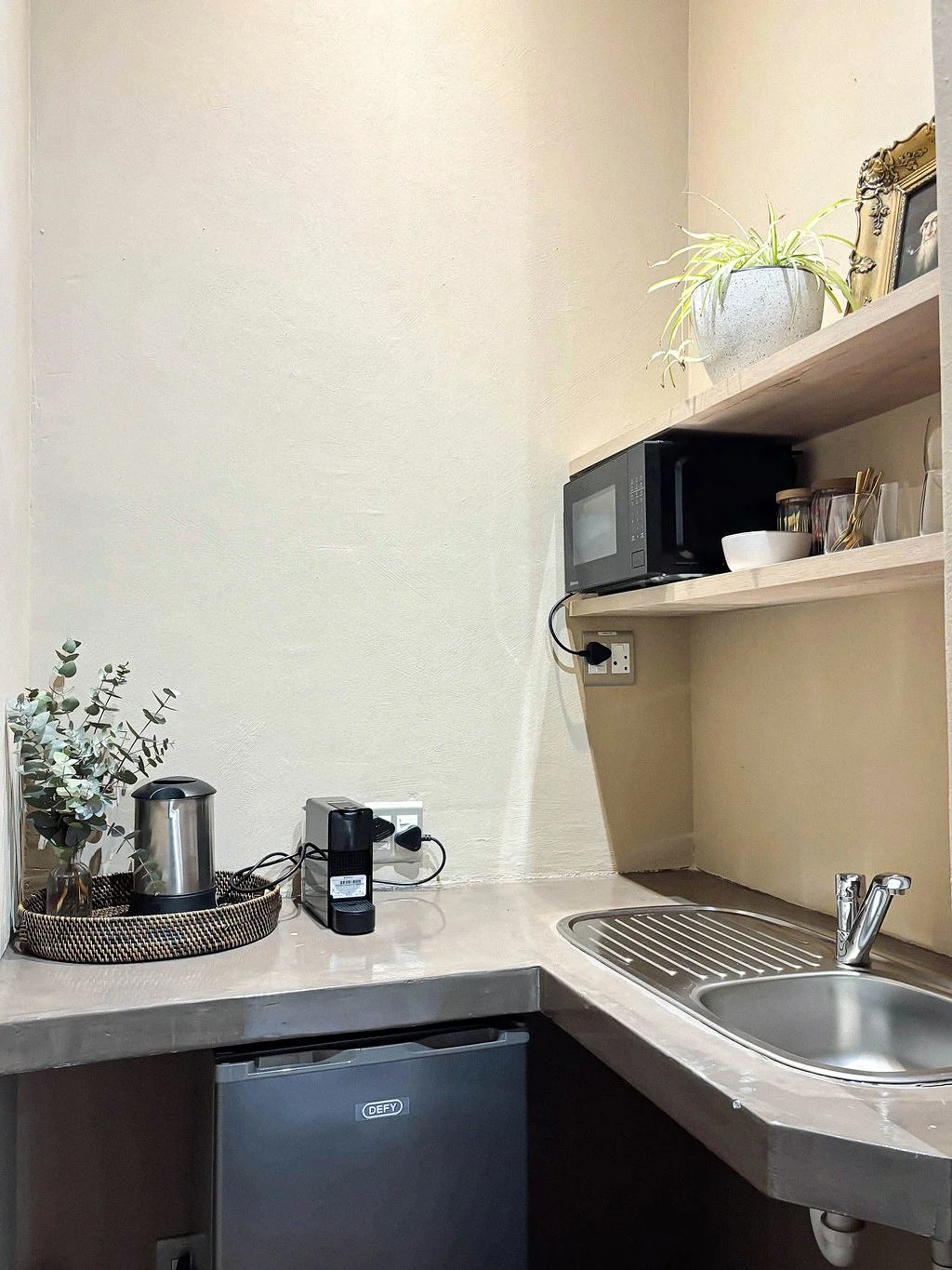 A practical kitchenette with a Nespresso machine, kettle, microwave, and bar fridge. We’ve included complimentary coffee, tea, sugar, milk, rusks, and bottled water.